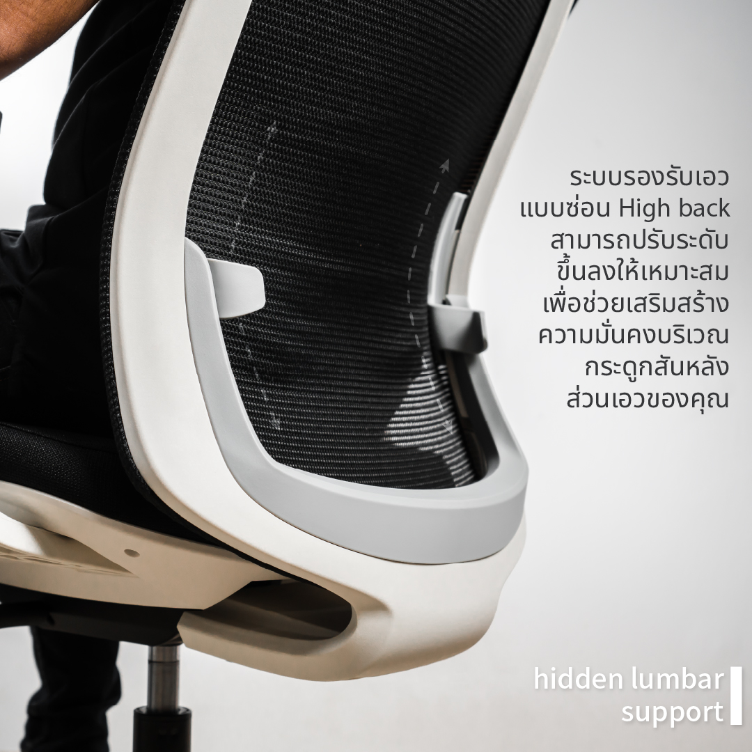การใช้งาน:ระบบรองรับเอวแบบซ่อน High back สามารถปรับระดับขึ้นลงให้เหมาะสมเพื่อช่วยเสริมสร้างความมั่นคงบริเวณกระดูกสันหลังส่วนเอวของคุณขณะเวลานั่ง