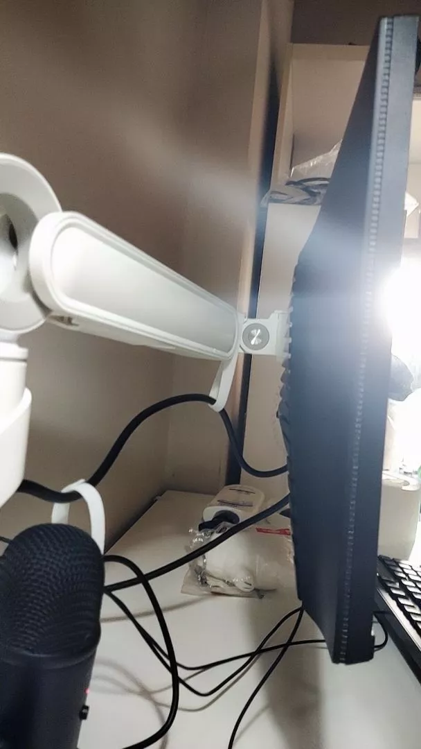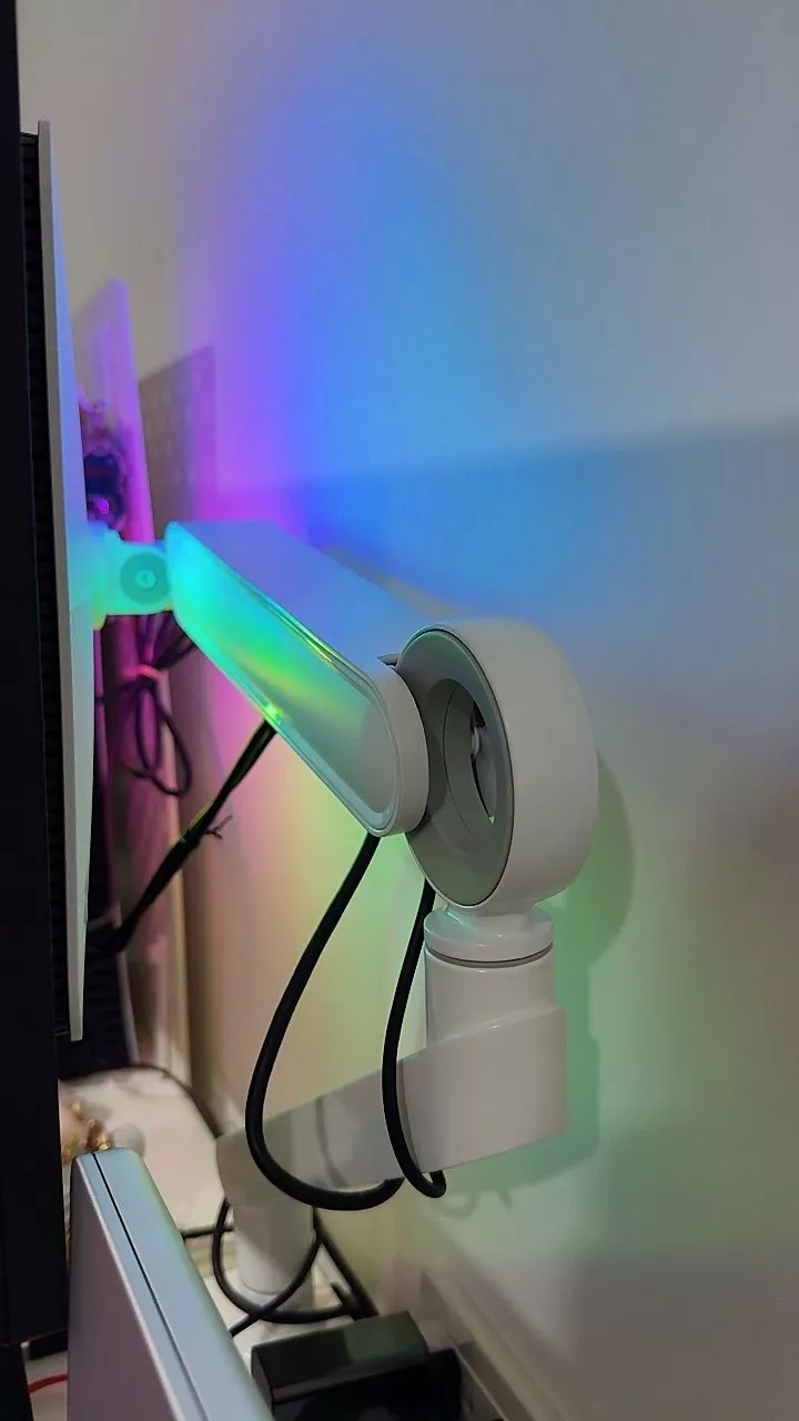 O-Ring Monitor Arm made of aluminum O-Ring Monitor Arm, single arm, white color. This monitor arm features a simple and elegant design that captures the essence of a ring shape as its main structure, conveying a sense of fluidity in every workspace. It is easier to install than previous models, allowing for quick assembly by one person in just a few minutes. The arm enables adjustment of the monitor at every angle and includes cable management to keep your desk looking tidy. Additionally, the base comes with USB-A/USB-C ports for data transfer and device charging.